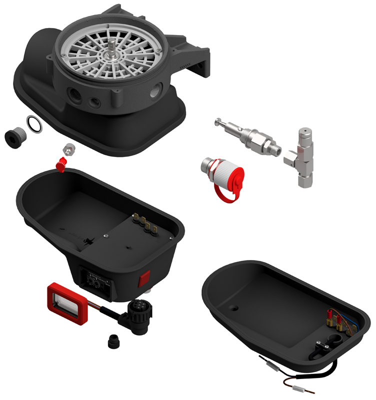 Perusvalikoima EP-1 pumpun varaosia, kuten moottorit, rungot, ohjausyksiköt ym.